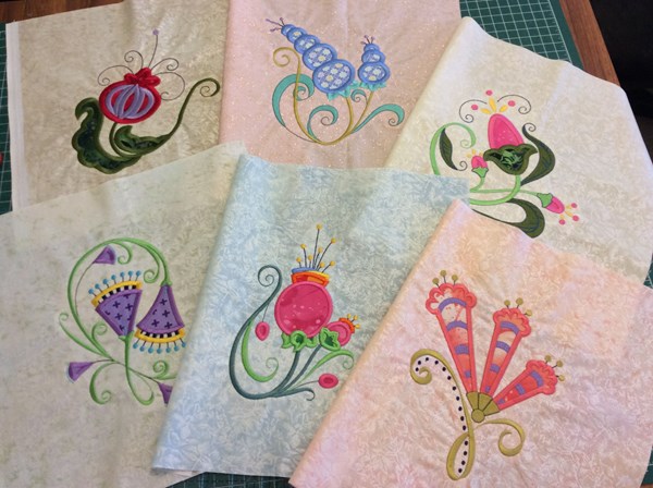The designs were resized to 6.5 inches as required, so that all the blocks had uniform sizing. The blocks were originally cut to 12 inches so that there was good space around the design for the hooping. Once stitched out and pressed the blocks were cut back to 9 ½ inches. (Picture 1)