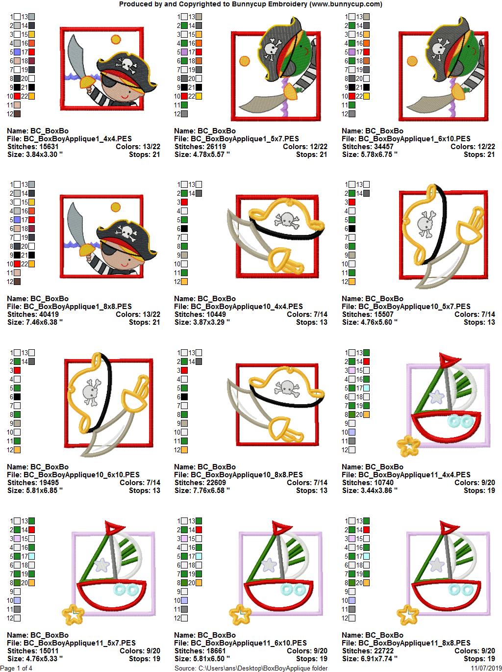 Box Boy Applique is an adorable collection of little boy embroidery designs in frames. From pirates to puppies to rocket ships and mustaches, these designs will warm your heart. These designs come in 4 sizes, one each for the 4x4, 5x7, 6x10 and 8x8 hoops. EMB files are also included in the downloads for precise resizing with the Wilcom Truesizer software (a free resizing software available at the Wilcom website). See our full range of