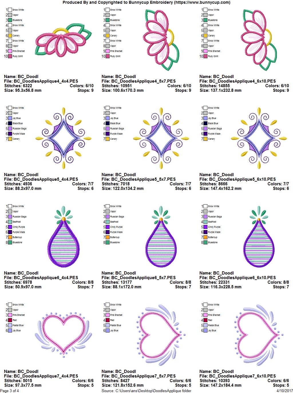 Doodles Applique is a fun collection of 14 doodle applique embroidery designs that are versatile for all age groups and projects. This collection includes 3 sizes, one for the 4x4 hoop, one for the 5x7 hoop and one for the 6x10 hoop. Wilcom EMB files are also included in the downloads for precise resizing with the Wilcom Truesizer software (a free resizing software available at the Wilcom website). See our full range of