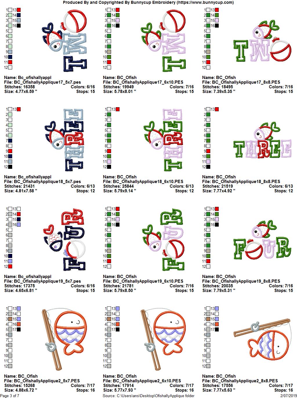 Ofishally Applique is an adorable collection of children's embroidery designs and perfect for birthday's and for the fishing loving family. All designs in this set include three sizes, once each for the 5x7, 6x10 and 8x8 hoops (please note 4x4 size is NOT available). See our full range of