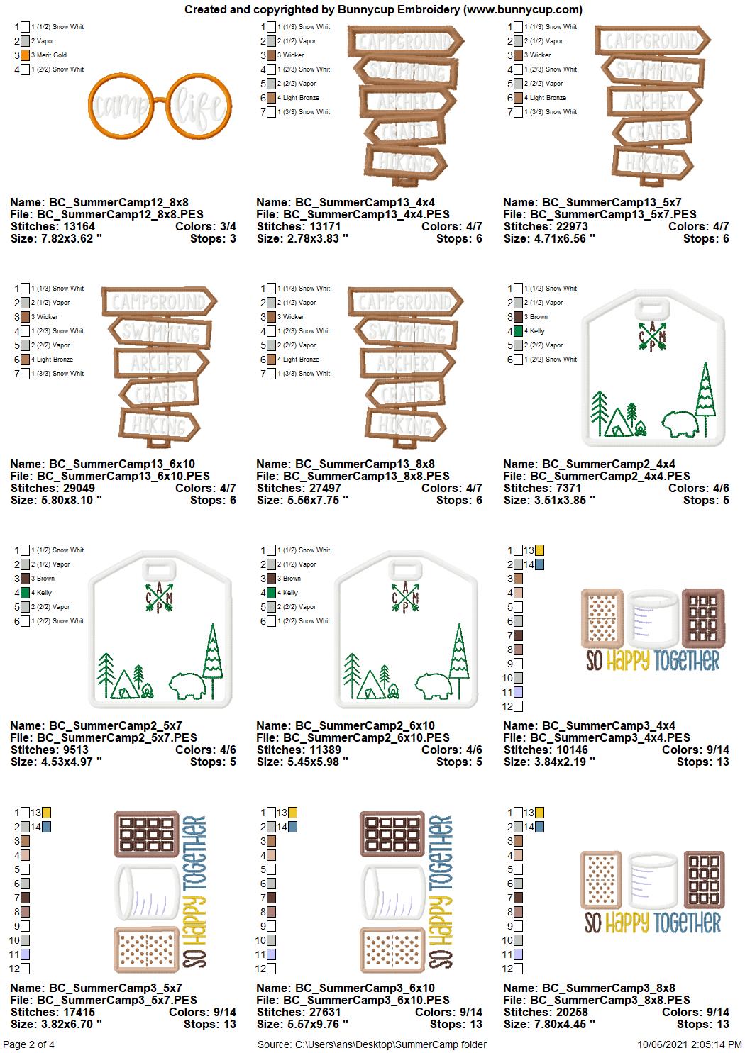 Summer Camp is perfect for those kids (or camp leaders) who enjoy going to Summer Camp. From a luggage tag to applique designs, sketch designs to subway art, there is a design suitable for everyone. The luggage tag is a simple in the hoop applique design. So Happy Together S'more, Summer Camp Scene, Summer Camp Badge, Boy Camp Life Sunglasses, Girl Camp Life Sunglasses and Summer Camp Sign are applique designs. Summer Camp Subway Art, Summer Camp Crew, Cutest Camper and Camp Grandma includes elements of sketch fill for a lighter density design. Camp Grandma can have the Grandma removed and customized with another name if preferred. Summer Camp Word Art includes two sizes, one each for the 4x4 and 5x7 hoops. Summer Camp Luggage Tag, Happy Summer Camper, Cutest Camper, Camp Grandma include three sizes, one each for the 4x4, 5x7 and 6x10 hoops. Summer Camp Scene includes three sizes, one each for the 5x7, 6x10 and 8x8 hoops. All other designs include four sizes, one each for the 4x4, 5x7, 6x10 and 8x8 hoops. EMB files are also included in the downloads for precise resizing with the Wilcom Workspace software (a resizing software available at the Wilcom website). See our full range of