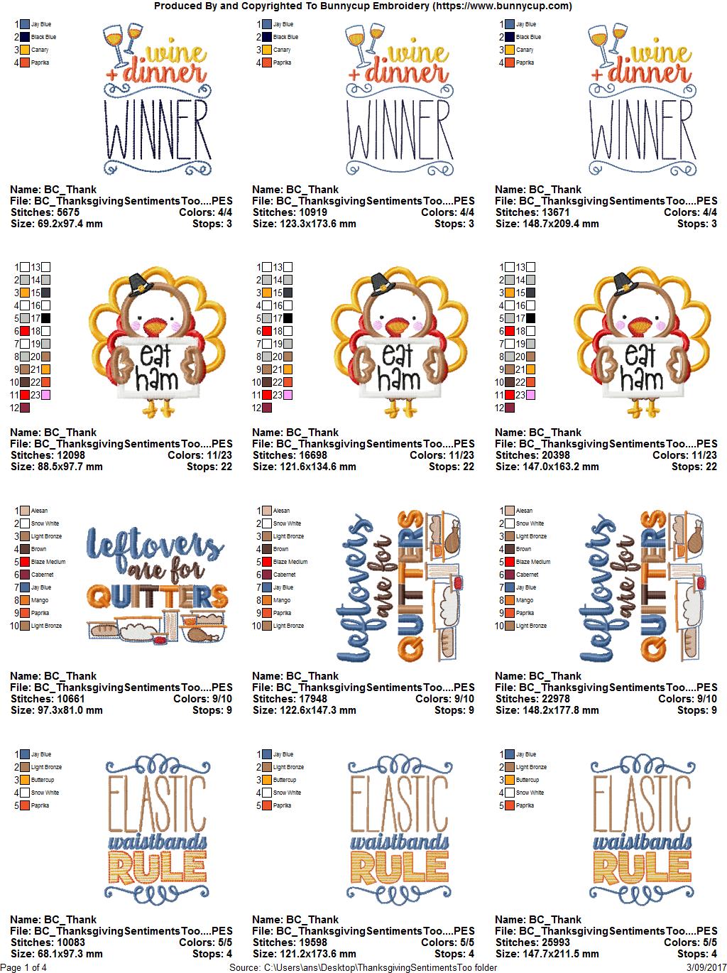Thanksgiving Sentiments Too is a follow on to our popular Thanksgiving Sentiments and is sure to make your Thanksgiving loads of fun. Please note that designs 5, 6, 10 and 13 are applique designs and the rest are filled stitch. All designs, besides designs 9 and 13 include 3 sizes, one each for the 4x4, 5x7 and 6x10 hoops. Design 9 comes in the 4x4 and 5x7 hoops only and design 13 is for the 6x10 hoop only. EMB files are also included in the downloads for precise resizing with the Wilcom Truesizer software (a free resizing software available at the Wilcom website). See our full range of