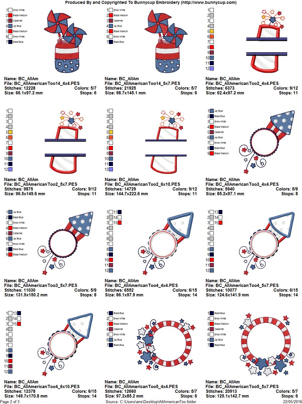 All American Too is a great set for fourth of July or as a celebration of the USA. This collection is a great collection of designs that you can monogram, add names to and stand alone designs. All designs in this collection come in two sizes - one for the 4x4 hoop and one for the 5x7 hoop. Additionally designs 2, 4, 6, 8, 9, 11, and 12 also include a 6x10 size. Designs 2 and 4 are applique designs. Wilcom EMB files are also included in the downloads for precise resizing with the Wilcom Truesizer software (a free resizing software available at the Wilcom website). See our full range of