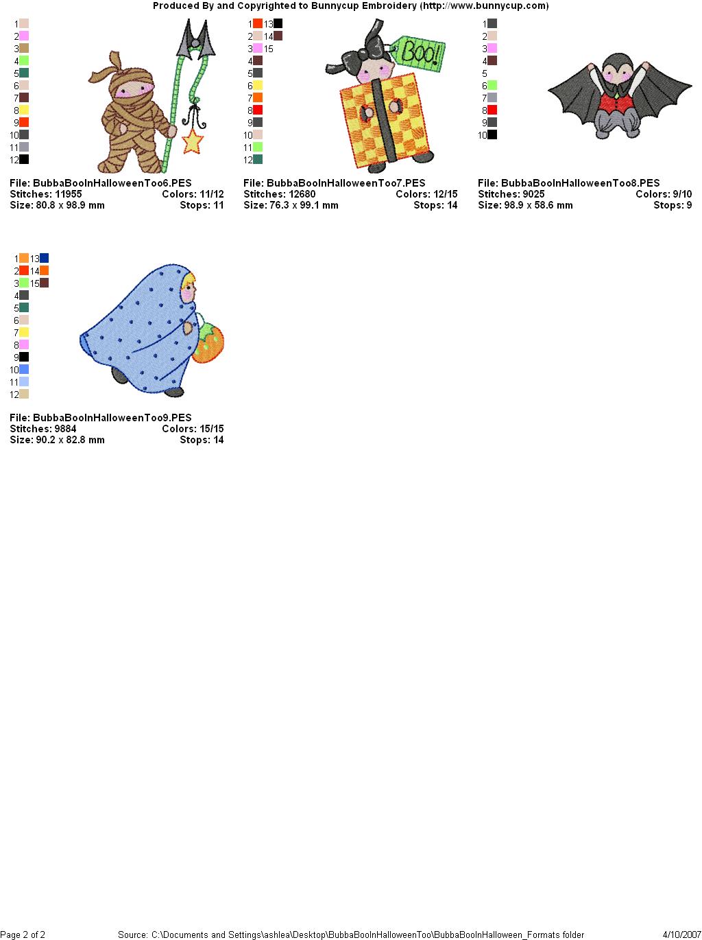 Another huge collection of 16 designs that are a follow on to the very popular Bubba Boo in Halloween set. Please note that the first 5 designs in this set (cat, tree, witch, spooky and fence) and design 16 (spider) require a 5x7 hoop. The remaining designs use a 4x4 hoop. SEW and PCS users, please note that 5x7 hoops are not avaliable in your format, so PES has been included for the 5x7 sized designs. See our full range of