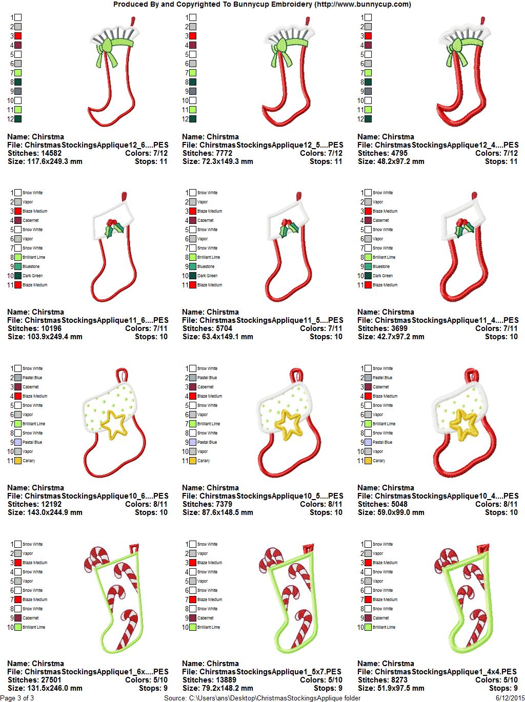 Christmas Stockings Applique is a wonderful collection of designs to help you celebrate Christmas. These applique designs come in three sizes, for the 4x4, 5x7 and 6x10 hoops. PCS and SEW users please note that as your machines do not support the 5x7 or lager hoops, the 5x7 and larger sizez are not available in your format and PES has been provided instead. Wilcom EMB files are also included in the downloads for precise resizing with the Wilcom Truesizer software (a free resizing software available at the Wilcom website). See our full range of