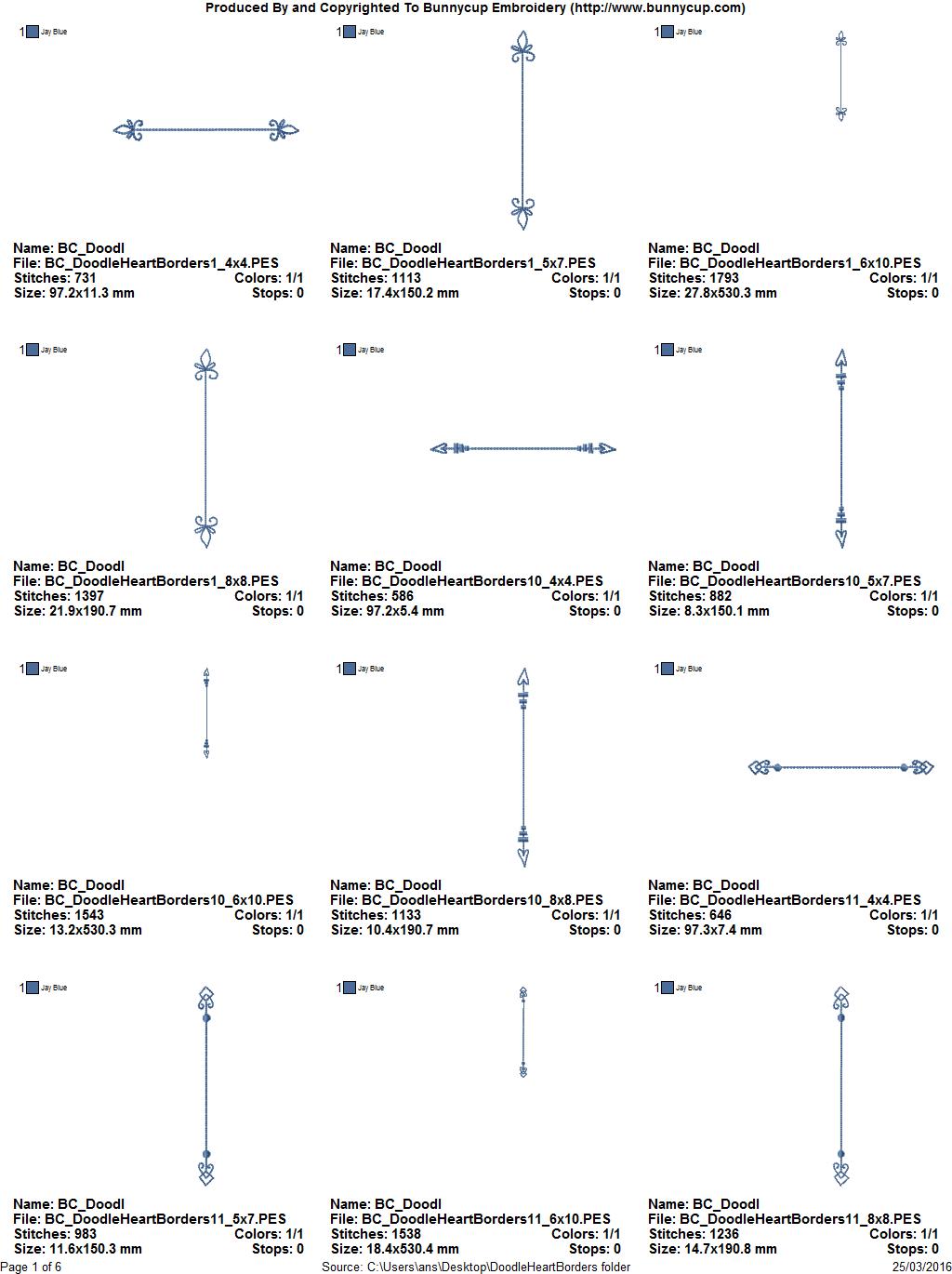 Doodle Heart Borders are a whimsical collection of border designs that are fabulous for so many things. Great on linens, or for decorating text plus so much more. These designs come in four different sizes, one each for the 4x4, 5x7, 8x8 and 6x10 hoops. PCS and SEW users please note that as your machines do not support the 5x7 or lager hoops, the 5x7 and larger sizes are not available in your format and PES has been provided instead. Wilcom EMB files are also included in the downloads for precise resizing with the Wilcom Truesizer software (a free resizing software available at the Wilcom website). See our full range of