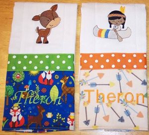 Donna made these adorable burp cloths using designs from Forest Animals and Be Thankful.