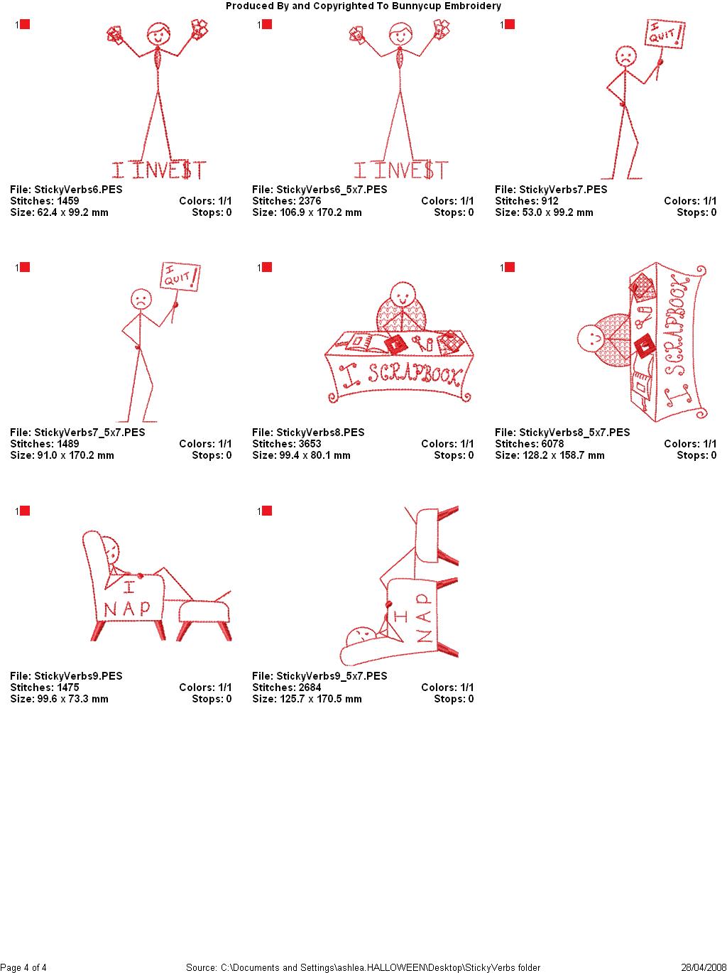 Sticky Verbs is a fun set of redwork stick people who are busy doing lots of different activities. Quick and easy to stitch and so effective on paper embroidery, totes, quick quilts and tshirts. The designs come in both the 4x4 and 5x7 hoop size. PCS and SEW users please note that as your machines do not support a 5x7 hoop the 5x7 designs are not avaliable in your format and PES will be provided instead. See our full range of